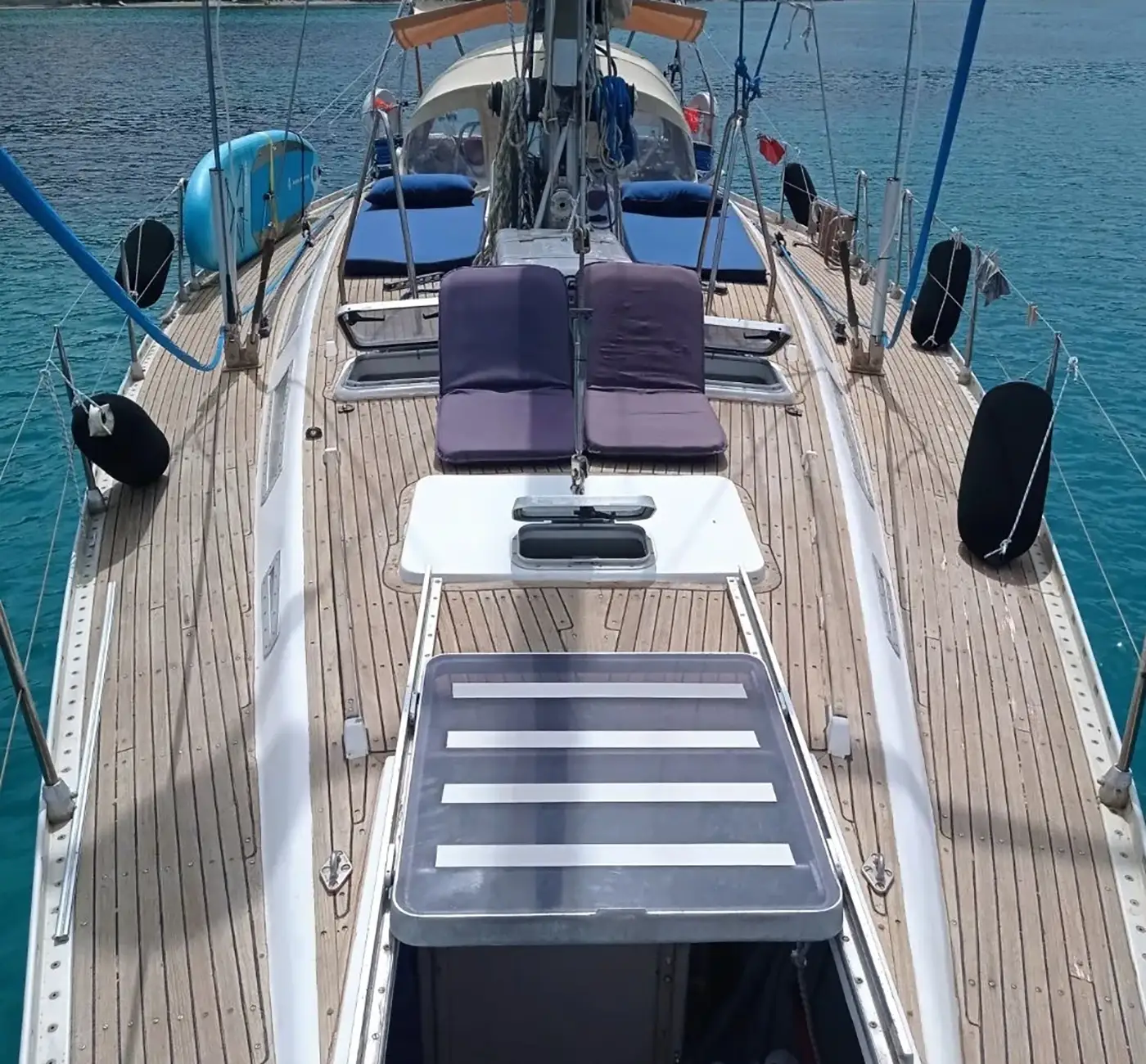 The boat is equipped with air conditioning, water-maker and electric hot/cold water generator. Externally it is completely covered in teak, 2 external single beds, 2 large awnings and a large cockpit. Αll winches for opening and closing the sails are electric. It is a truly complete boat for spending an unforgettable holiday in total safety and comfort.